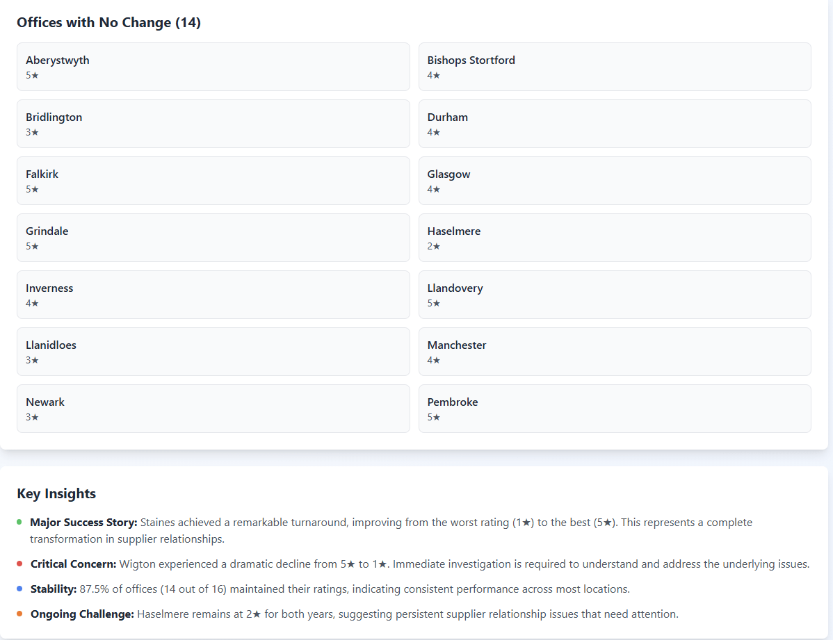 Actually it didn’t just comment on the switch, it noted that one office only had a 2* rating and that stayed the same so there has been no improvement there and that needs attention – which is something I didn’t think about as I was focused on the “big switch” not the nuance of a poor performer not improving, but obviously the results depend on the LLM you are using and also how you prompt it.
