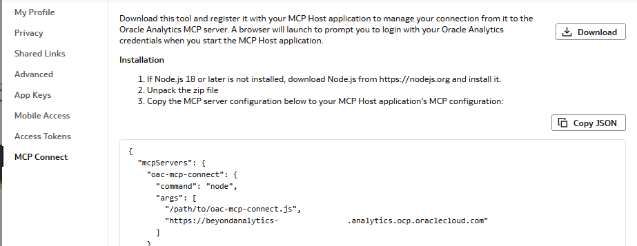 Let’s set it up. You can follow along with the instructions in the blog linked to above so I won’t repeat them here, however it is worth looking at the new MCP Connect which appears in the profile setting in the November 2025 release of OAC as that isn’t screenshotted in the Oracle blog. This gives us some instructions as well about installing Node.js and as further enhancements are made then things could change, so it’s worth looking at what is written here.