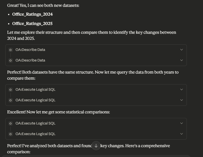 The results of this are that I get confirmation that the dataset can be seen. It can now use OA: Describe Data to look at the dataset structures (so it can tell they are suitable for comparison) and use OA: Execute Logical SQL to query the data.