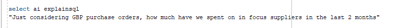 - The query retrieves the total spend on in-focus suppliers for GBP purchase orders in the last 2 months.