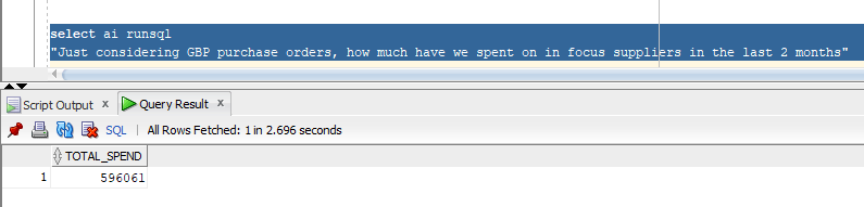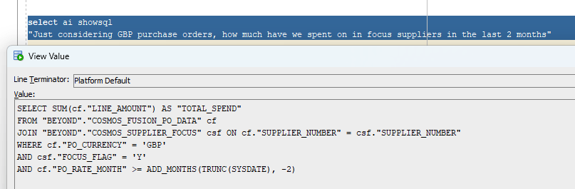 Before we start, we just need to set the profile. We can of course have multiple different profiles if we want to use different LLMs or pass/hide parameters. In this example i’m in a SQL interface, if I was to do this in APEX for a “friendly front end” we need to use GENERATE (see here) and i’ll leave that for another article.